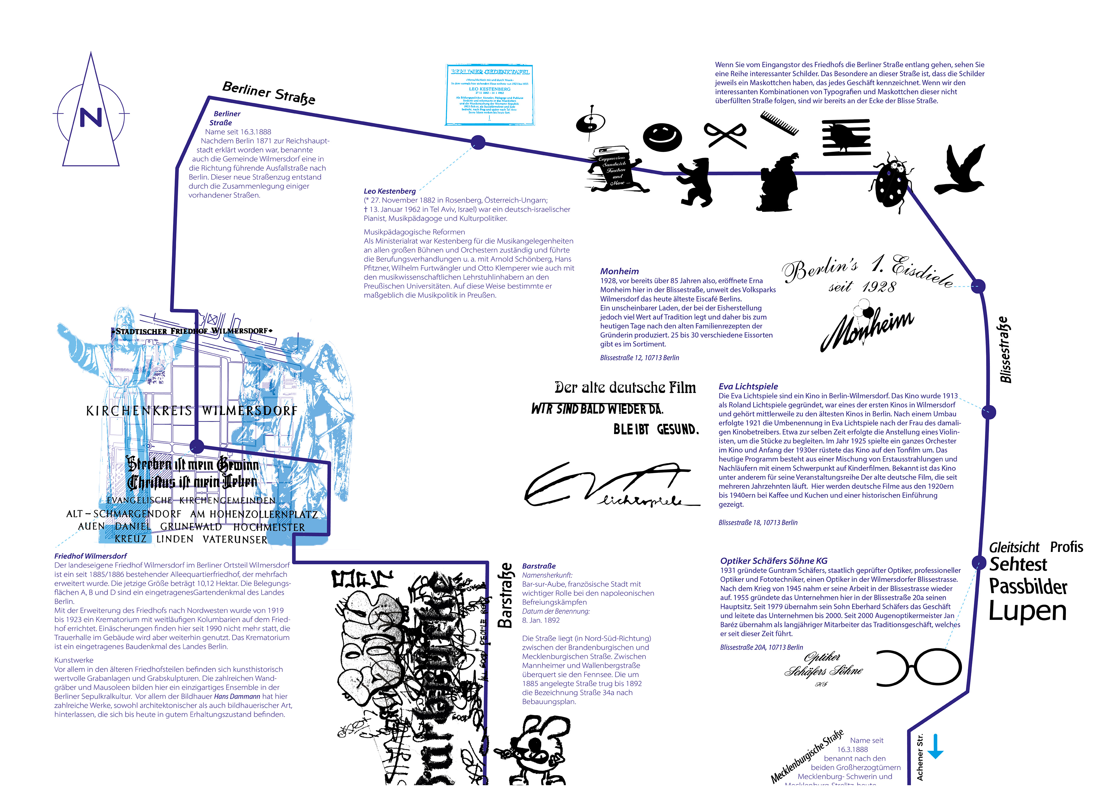 Diese Karte ist ein typografisches Kiezprojekt, das Typografien visualisiert, die von Oktober 2020 bis Januar 2021 direkt vom Heidelberger Platz bis Blissestraße in Wilmersdorf, Berlin gesammelt wurden. Die Typografien auf den Straßen sind Manifestationen der psychischen und physischen Nutzung des Ortes. Typografie ist daher nicht nur ein Medium für die Übermittlung von Stadtinformationen, sondern auch eine Spur der Geschichte und ein Symbol für Straßen. Diese Typografiekarte soll das intuitive Verständnis der Nutzung des Stadtraums erleichtern und darauf hinweisen, dass die Typografie selbst eine Vielzahl von Rollen spielt in der Stadt. Als separater Anhang werden die auf der lokalen Typografiekarte gefundenen Orte nach den Merkmalen des Ortes klassifiziert, und Indexelemente wurden zur einfachen Suche separat erstellt. Wenn Sie das Innere dieses Heftes weit öffnen, gibt es eine große Karte, die eine Sparzierwegkarte für die Interaktion mit der Designerin (Ich) und der Leserin/dem Leser ist. Die Leser*innen/s können gemeinsam am Startpunkt Heidelberger Platz entlang dieser Karte gehen, um die charakteristische Typografie jedes Ortes zu finden oder entsprechende historische Informationen zu erhalten.